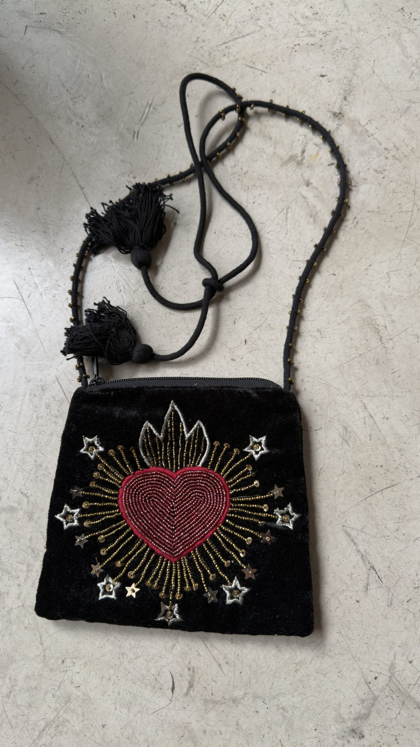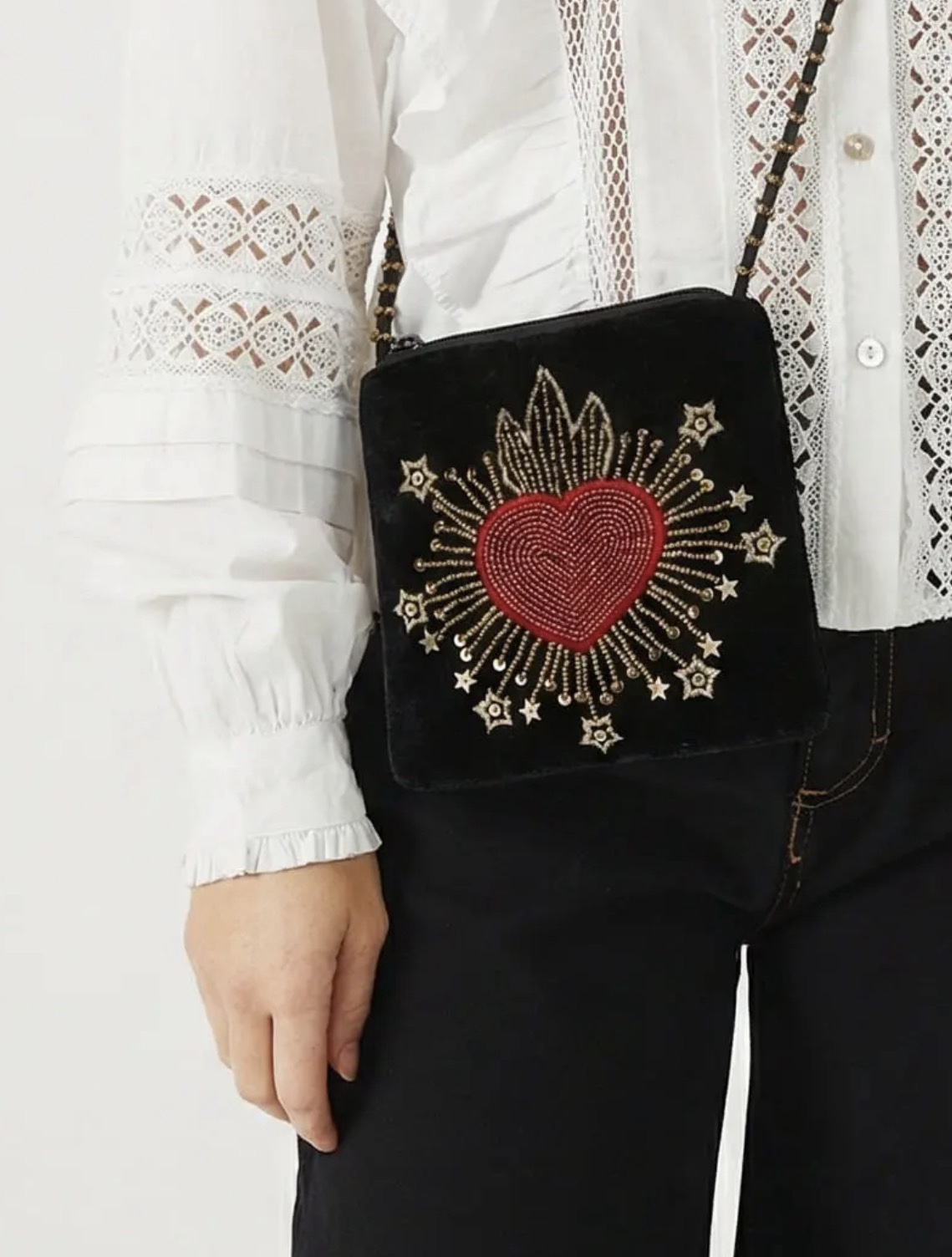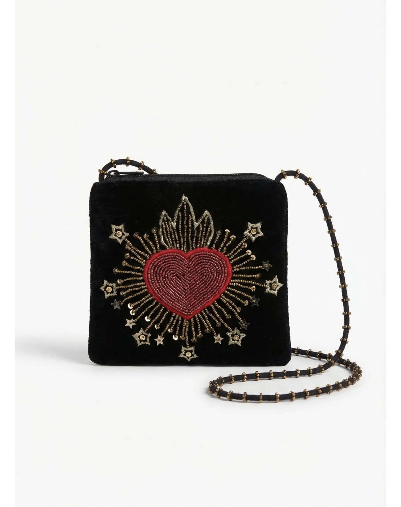 Cartera de terciopelo con bordado a mano en el frente, que aporta un detalle artesanal y sofisticado. De tamaño pequeño, es ideal para llevar lo esencial. Cuenta con correa regulable para usar cruzada, combinando practicidad y estilo en una pieza única.